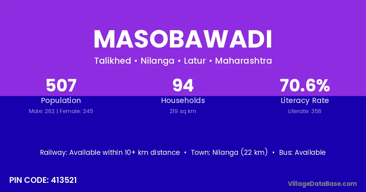 Nilanga (22 km) is the nearest town to Masobawadi village for major economic activities and is located approximately 22 km away.