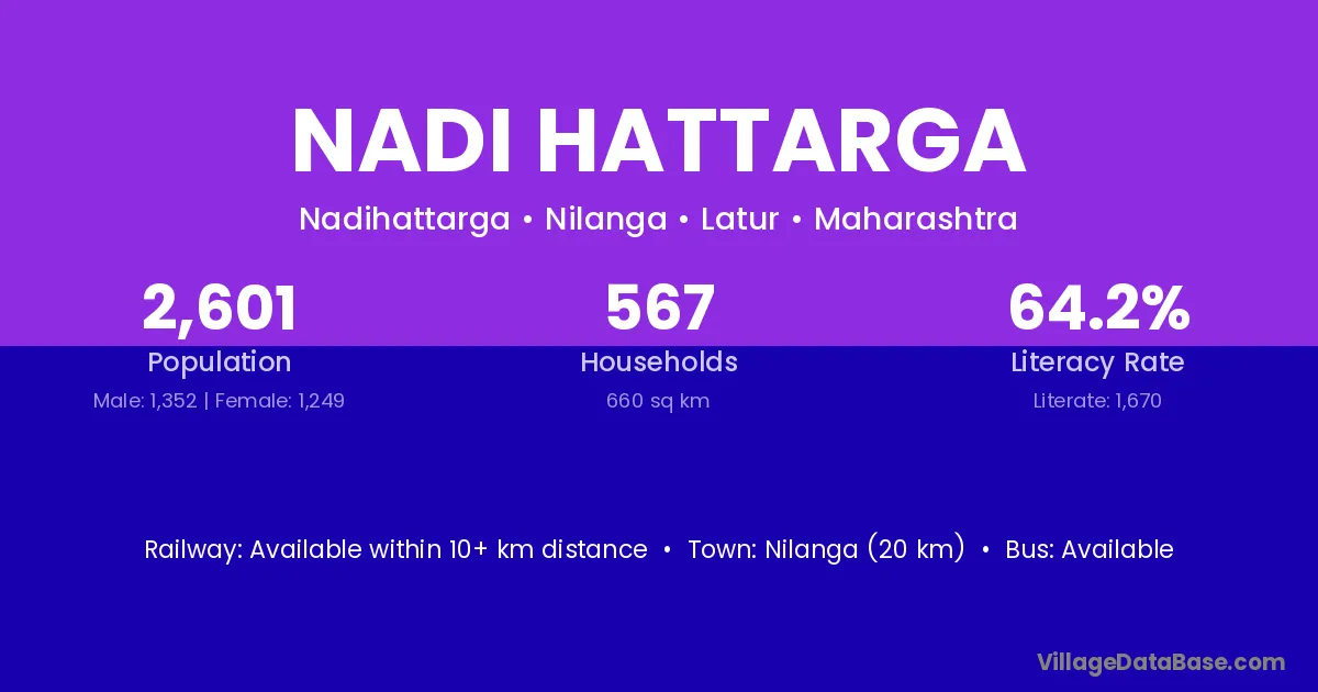 Nilanga (20 km) is the nearest town to Nadi Hattarga village for major economic activities and is located approximately 20 km away.