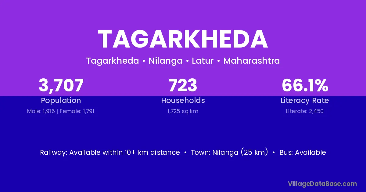 Nilanga (25 km) is the nearest town to Tagarkheda village for major economic activities and is located approximately 25 km away.