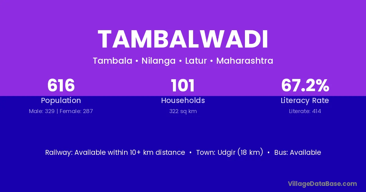 Udgir (18 km) is the nearest town to Tambalwadi village for major economic activities and is located approximately 18 km away.