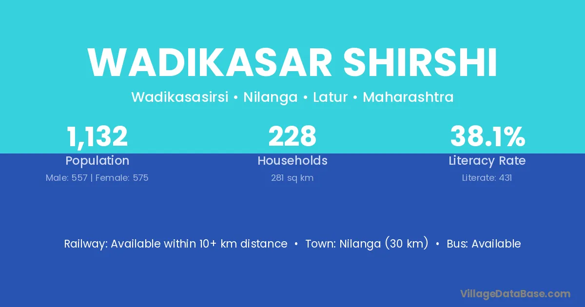 Nilanga (30 km) is the nearest town to Wadikasar Shirshi village for major economic activities and is located approximately 30 km away.