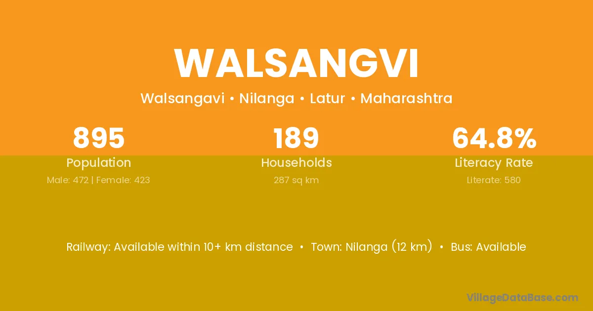 Nilanga (12 km) is the nearest town to Walsangvi village for major economic activities and is located approximately 12 km away.