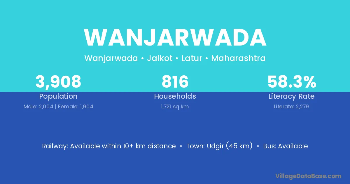 Nilanga (22 km) is the nearest town to Wanjarwada village for major economic activities and is located approximately 22 km away.