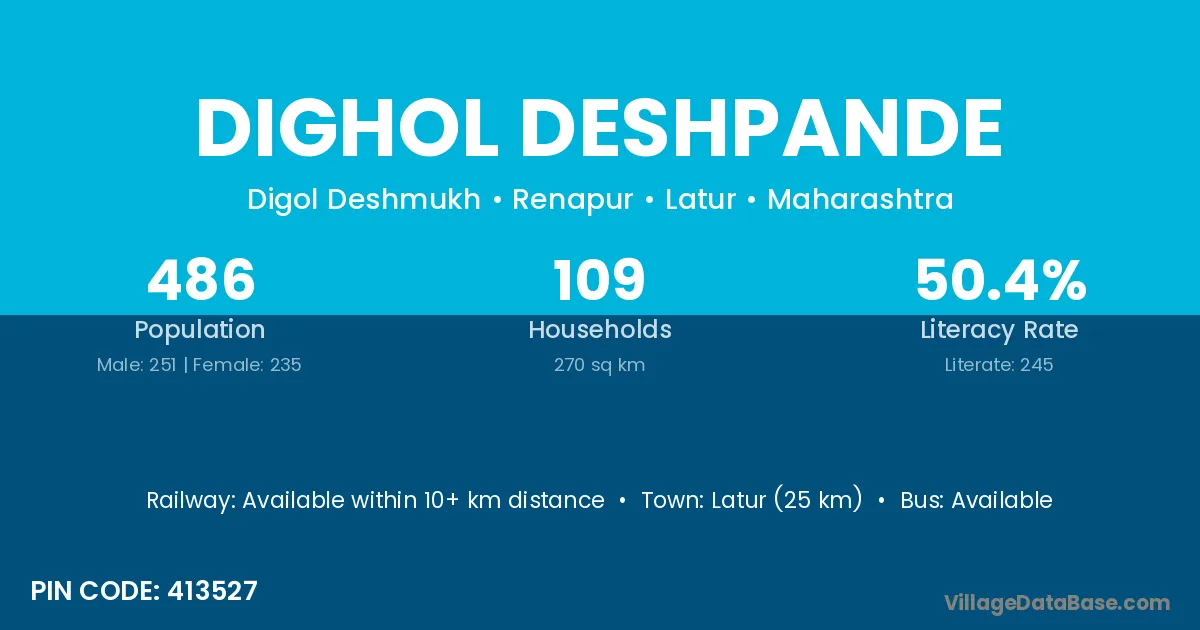 Dighol Deshpande village has a total population of 486 people, of which 251 are males and 235 are females.