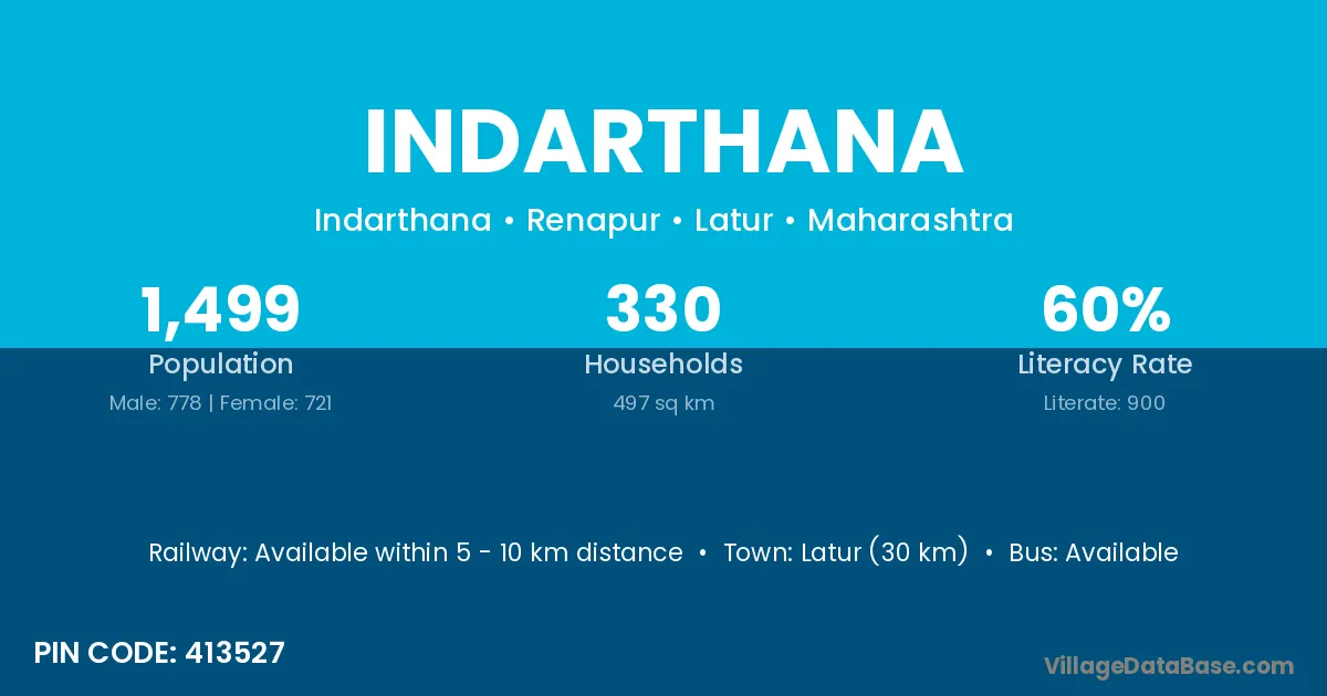 Latur (30 km) is the nearest town to Indarthana village for major economic activities and is located approximately 30 km away.