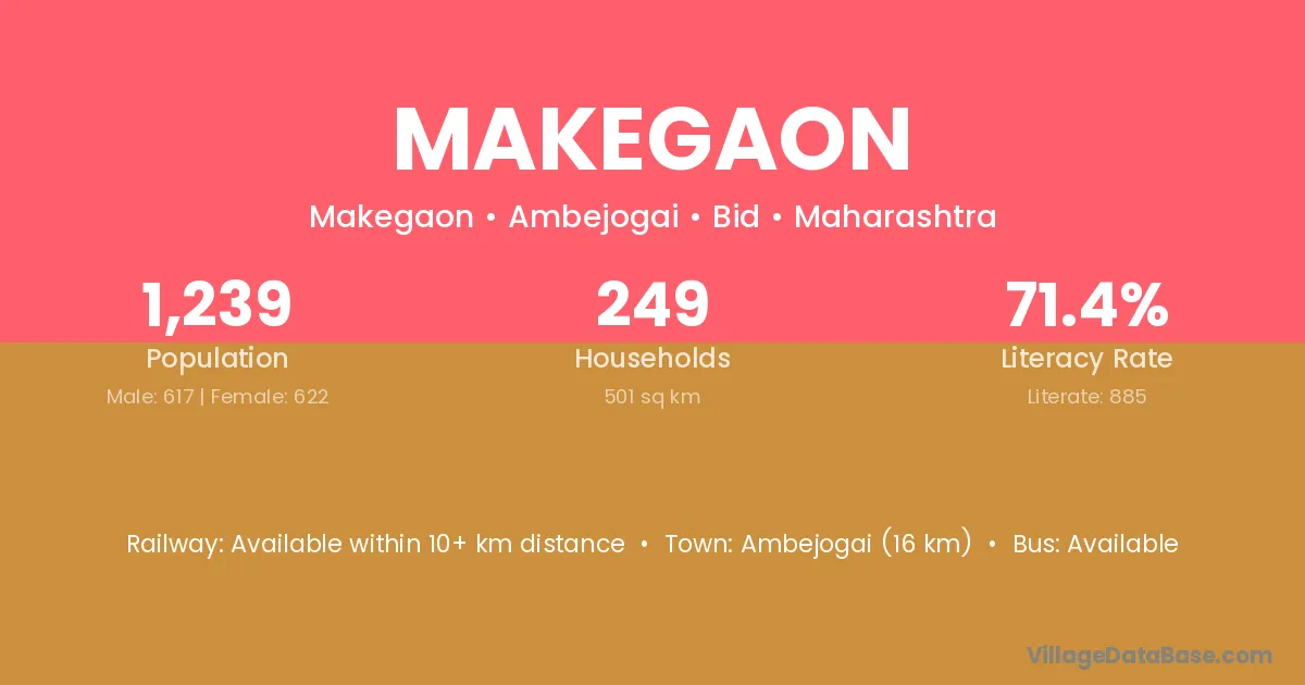 Latur (65 km) is the nearest town to Makegaon village for major economic activities and is located approximately 65 km away.