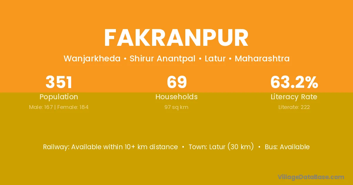 Latur (30 km) is the nearest town to Fakranpur village for major economic activities and is located approximately 30 km away.