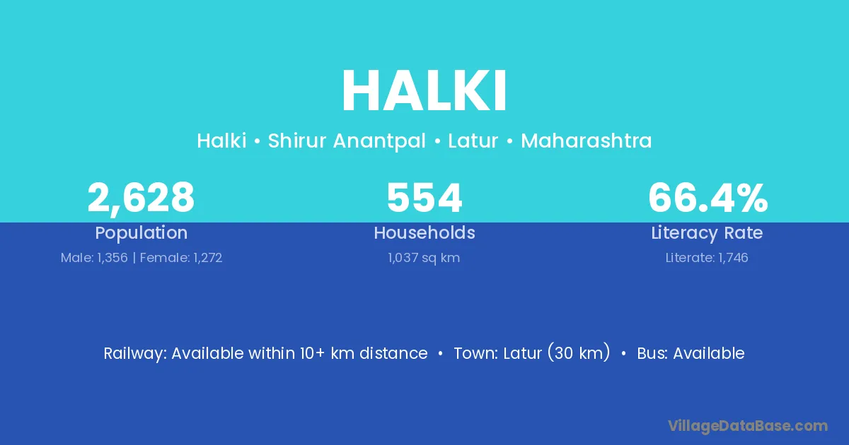 Latur (30 km) is the nearest town to Halki village for major economic activities and is located approximately 30 km away.