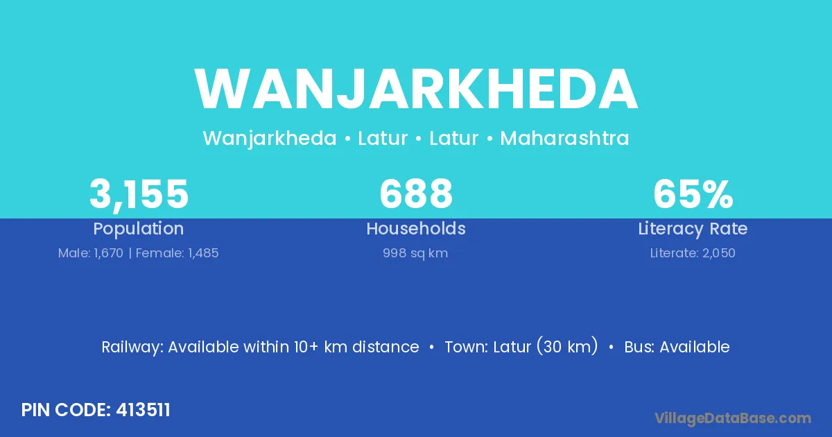 Latur (32 km) is the nearest town to Wanjarkheda village for major economic activities and is located approximately 32 km away.