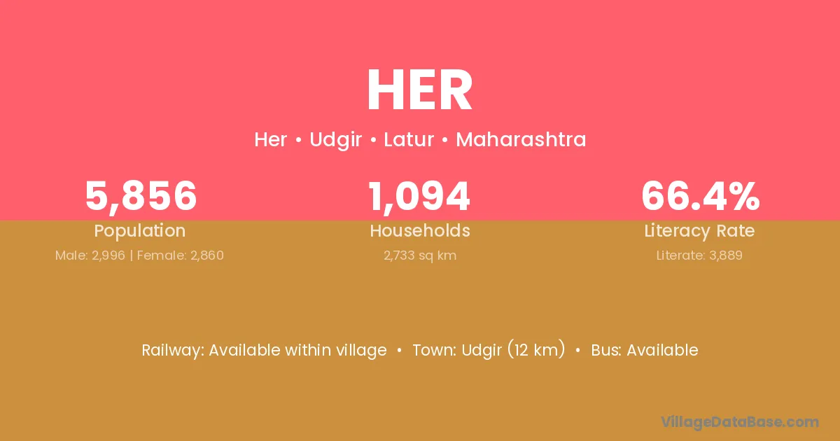 Udgir (12 km) is the nearest town to Her village for major economic activities and is located approximately 12 km away.