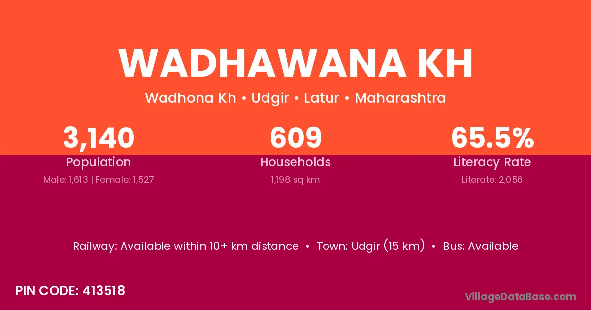 Udgir (15 km) is the nearest town to Wadhawana Kh village for major economic activities and is located approximately 15 km away.
