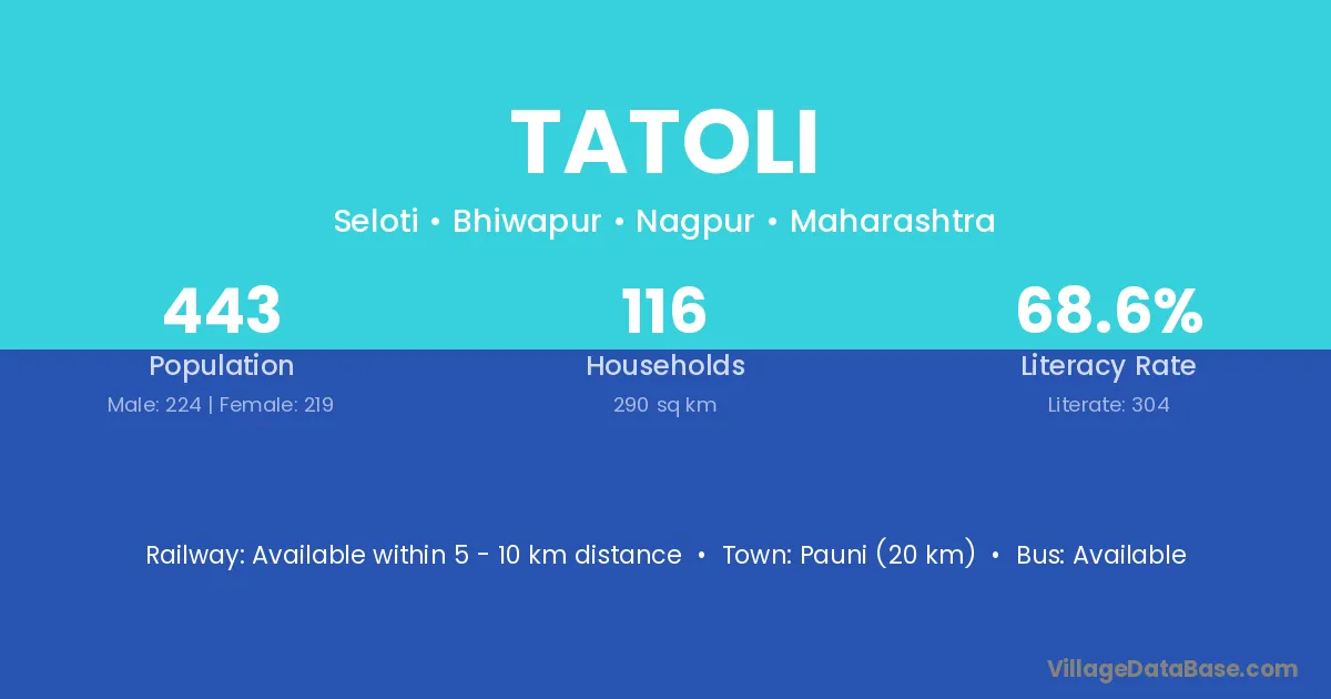 Pauni (20 km) is the nearest town to Tatoli village for major economic activities and is located approximately 20 km away.