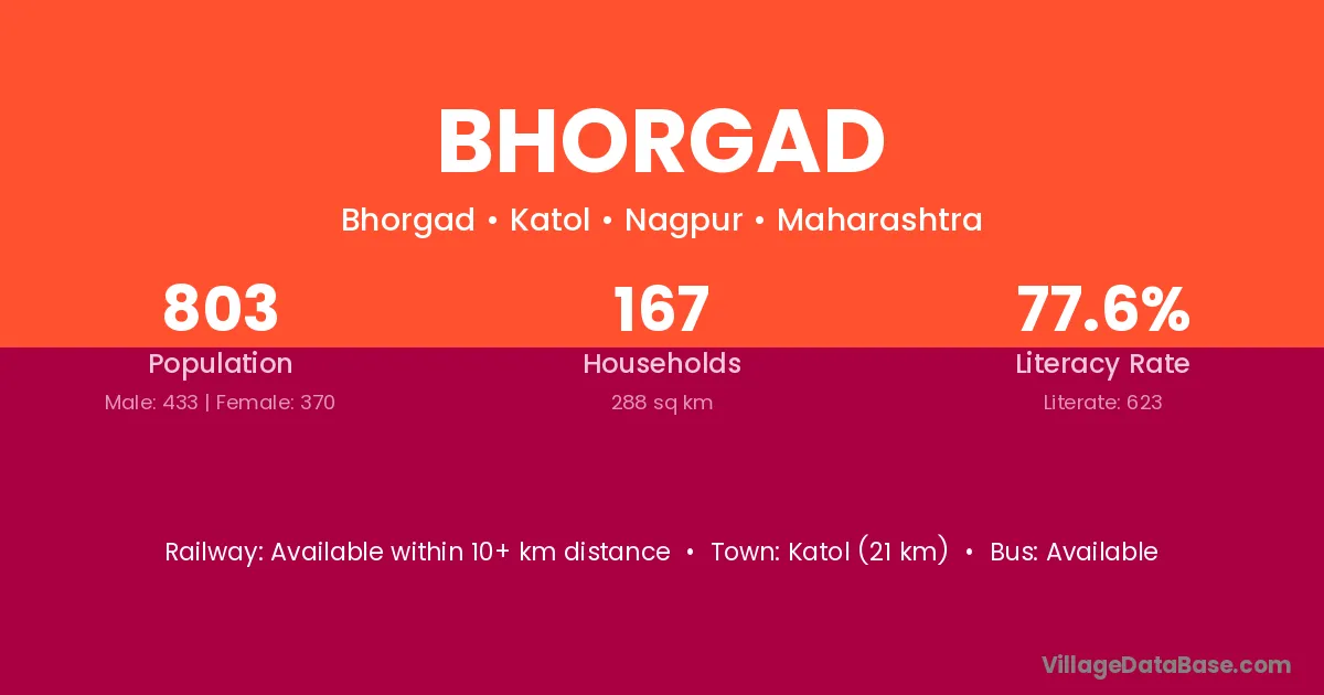 Katol (21 km) is the nearest town to Bhorgad village for major economic activities and is located approximately 21 km away.