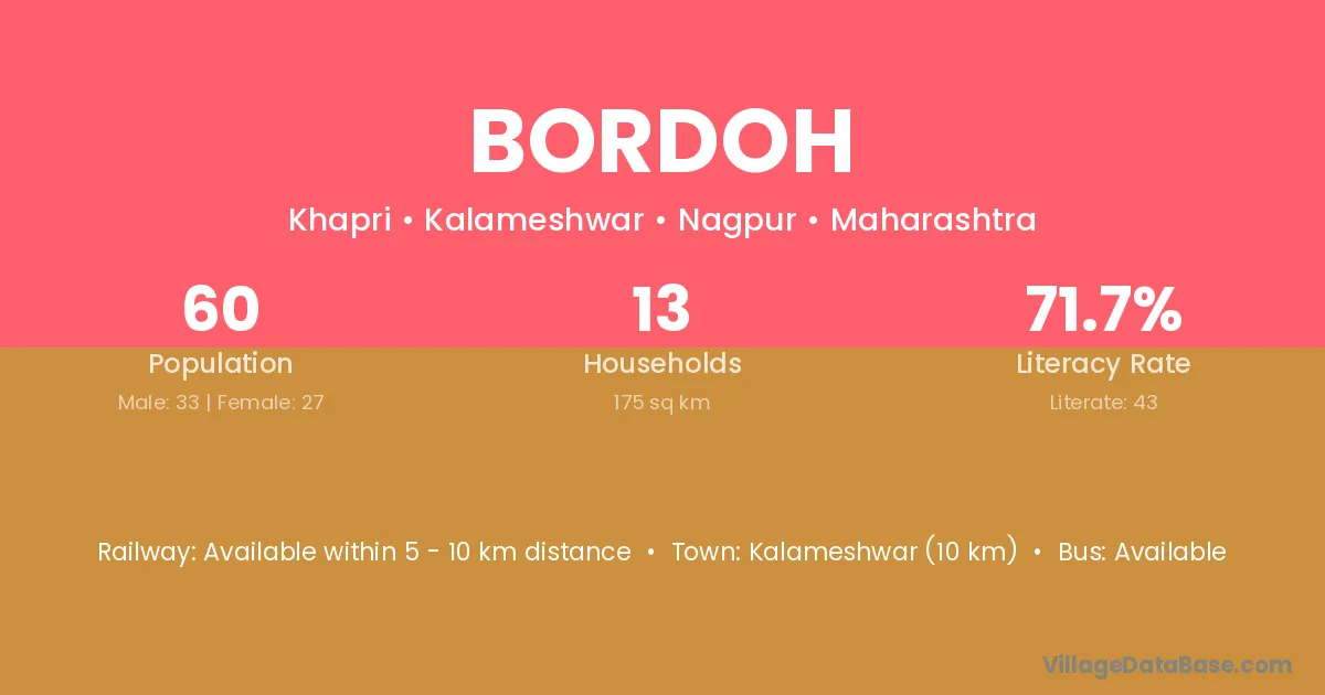 Katol (10 km) is the nearest town to Bordoh village for major economic activities and is located approximately 10 km away.