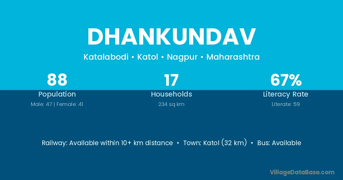Katol (32 km) is the nearest town to Dhankundav village for major economic activities and is located approximately 32 km away.