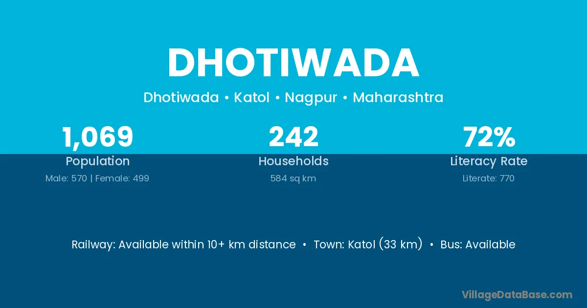 Katol (33 km) is the nearest town to Dhotiwada village for major economic activities and is located approximately 33 km away.
