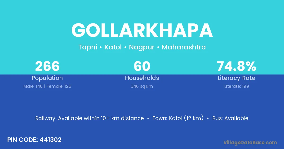 Katol (12 km) is the nearest town to Gollarkhapa village for major economic activities and is located approximately 12 km away.