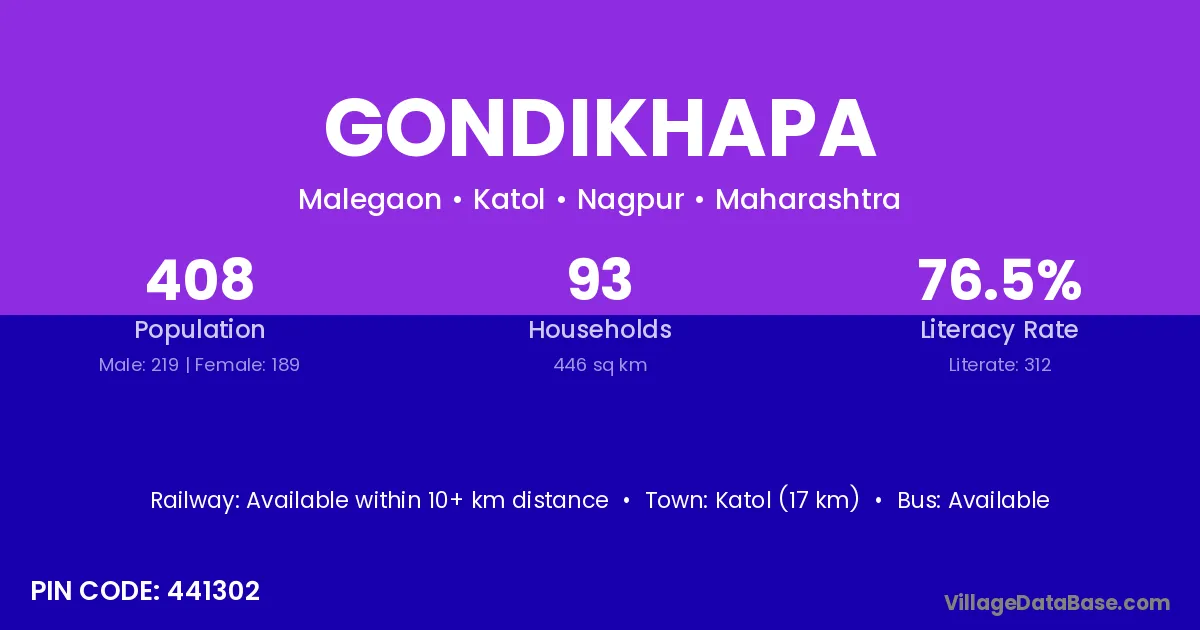Katol (17 km) is the nearest town to Gondikhapa village for major economic activities and is located approximately 17 km away.