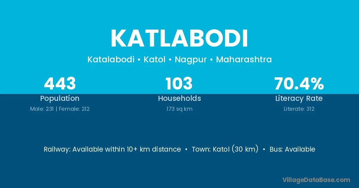 Katol (30 km) is the nearest town to Katlabodi village for major economic activities and is located approximately 30 km away.