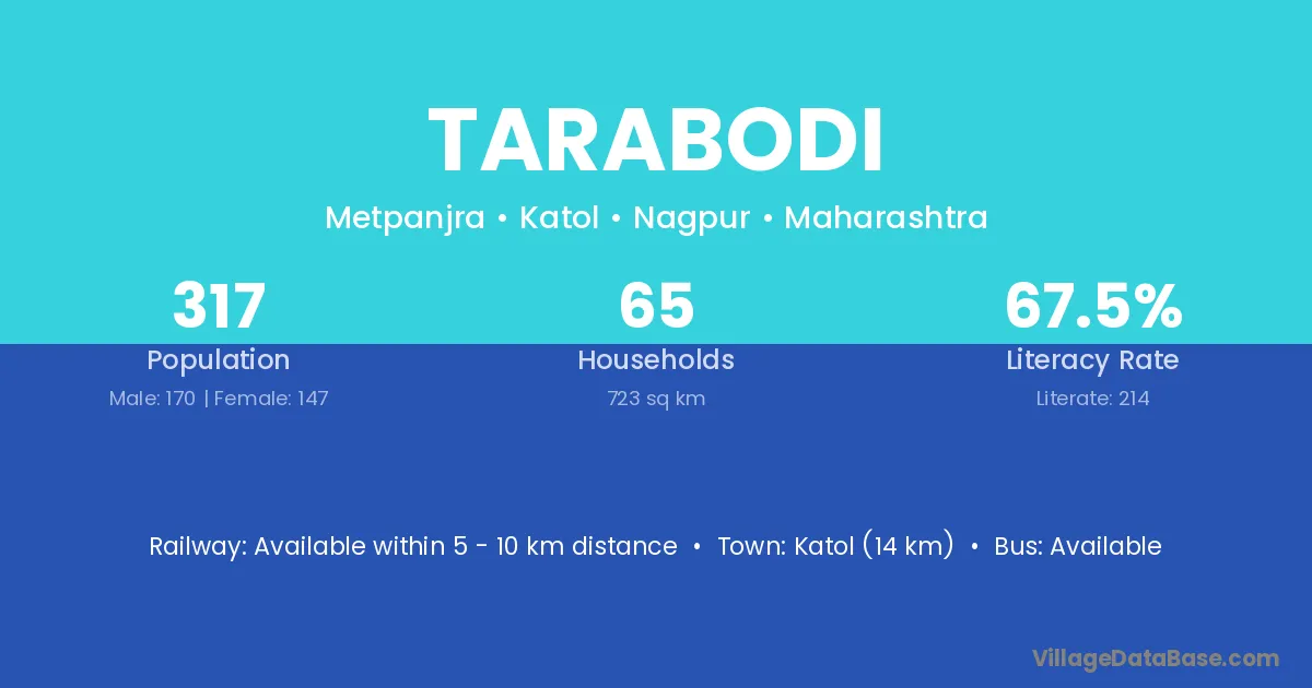 Katol (14 km) is the nearest town to Tarabodi village for major economic activities and is located approximately 14 km away.