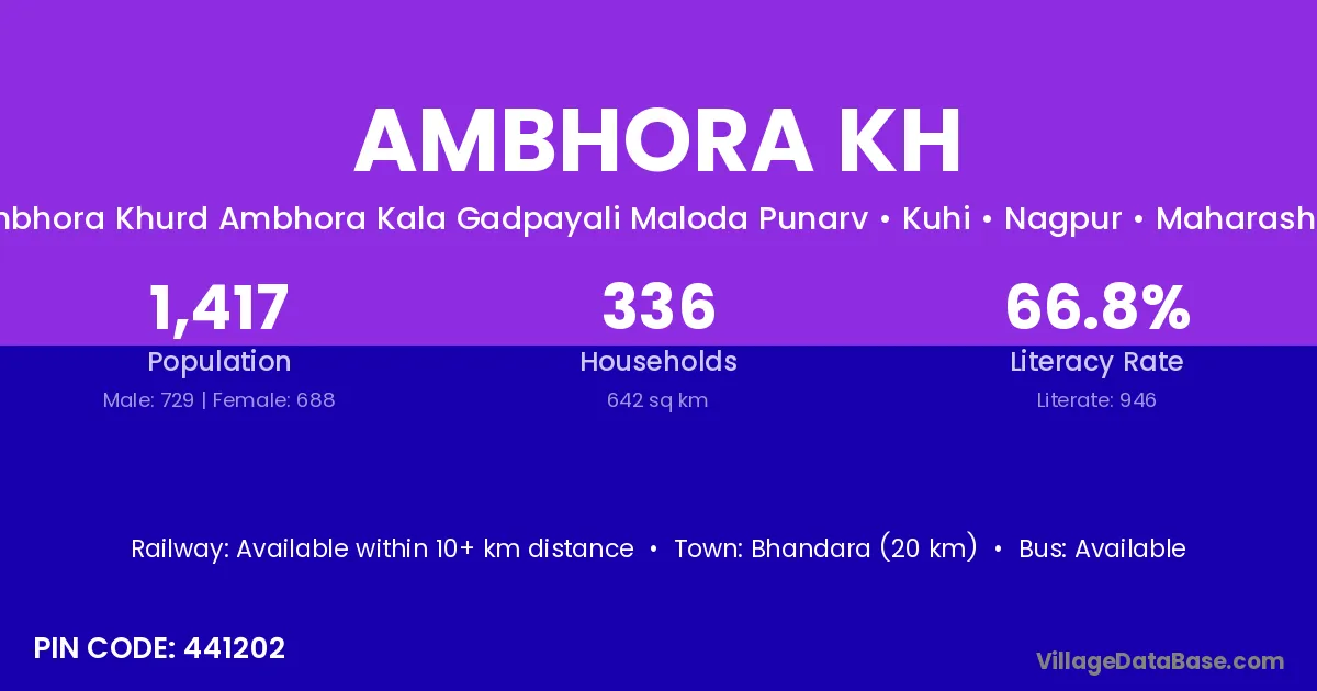 Bhandara (20 km) is the nearest town to Ambhora Kh village for major economic activities and is located approximately 20 km away.