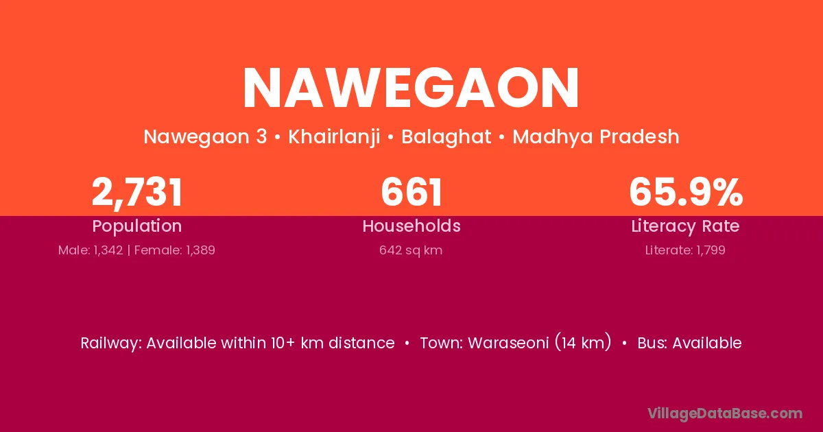 Ramtek (22 km) is the nearest town to Nawegaon village for major economic activities and is located approximately 22 km away.