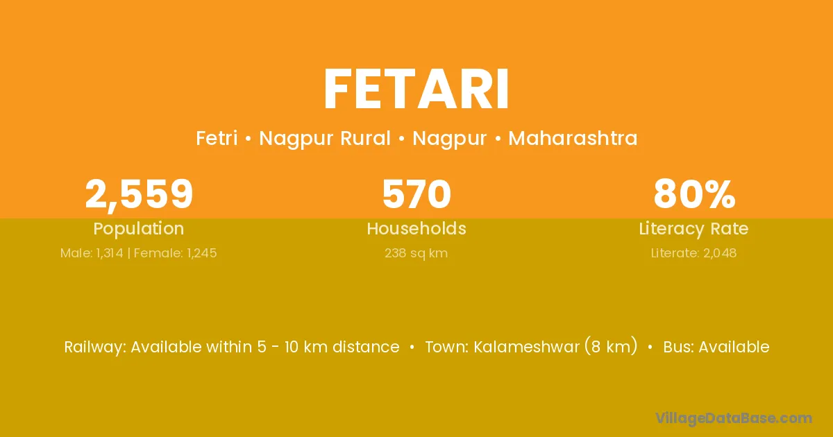 Kalameshwar (8 km) is the nearest town to Fetari village for major economic activities and is located approximately 8 km away.