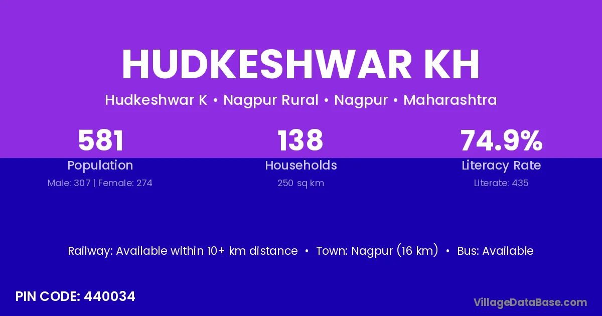 Nagpur (16 km) is the nearest town to Hudkeshwar Kh village for major economic activities and is located approximately 16 km away.