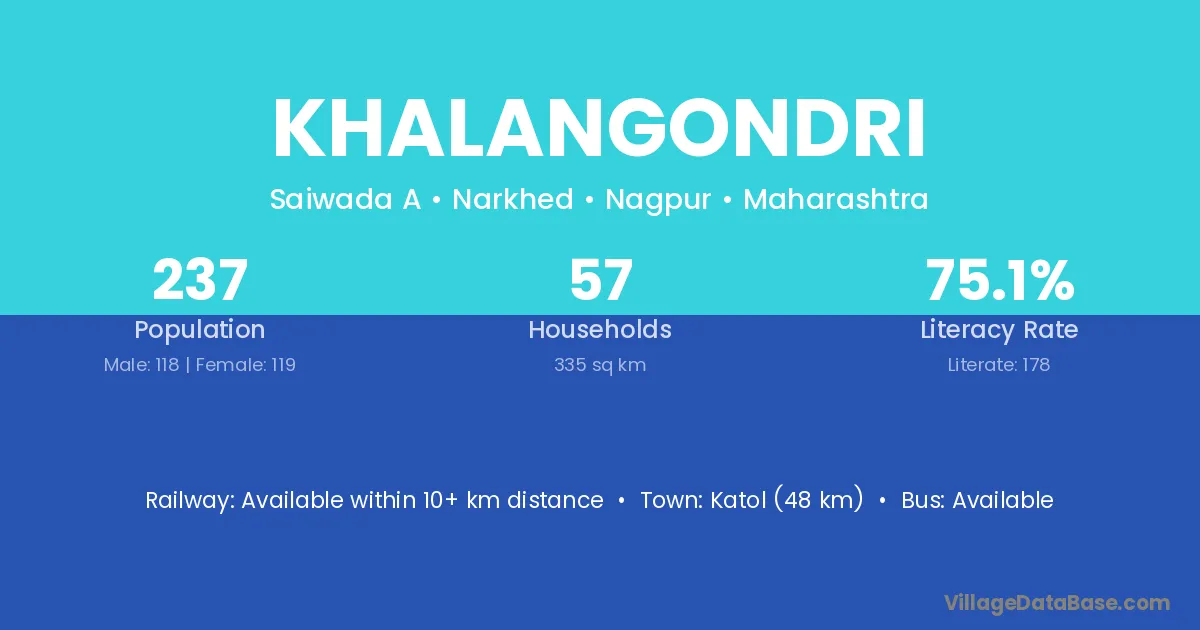Katol (48 km) is the nearest town to Khalangondri village for major economic activities and is located approximately 48 km away.