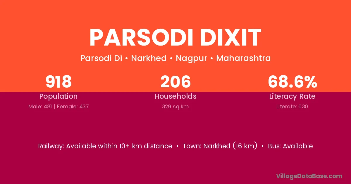 Narkhed (16 km) is the nearest town to Parsodi Dixit village for major economic activities and is located approximately 16 km away.