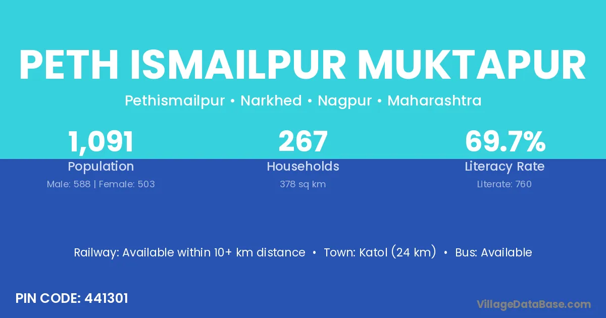Katol (24 km) is the nearest town to Peth Ismailpur Muktapur village for major economic activities and is located approximately 24 km away.