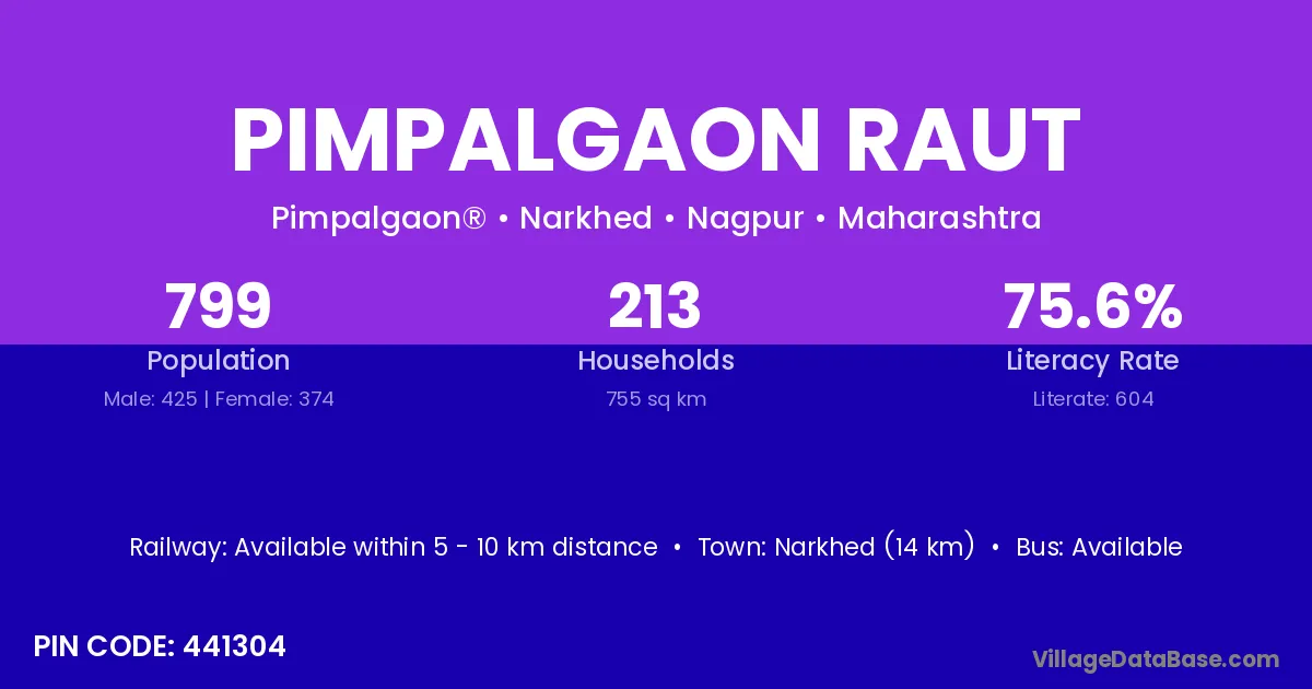 Narkhed (14 km) is the nearest town to Pimpalgaon Raut village for major economic activities and is located approximately 14 km away.