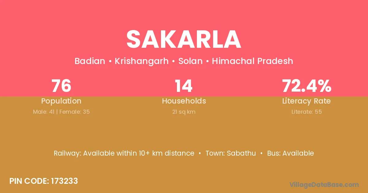 The literacy rate of Sakarla village is 67.38%. Male literacy stands at 71.48% and female literacy at 63.00%.