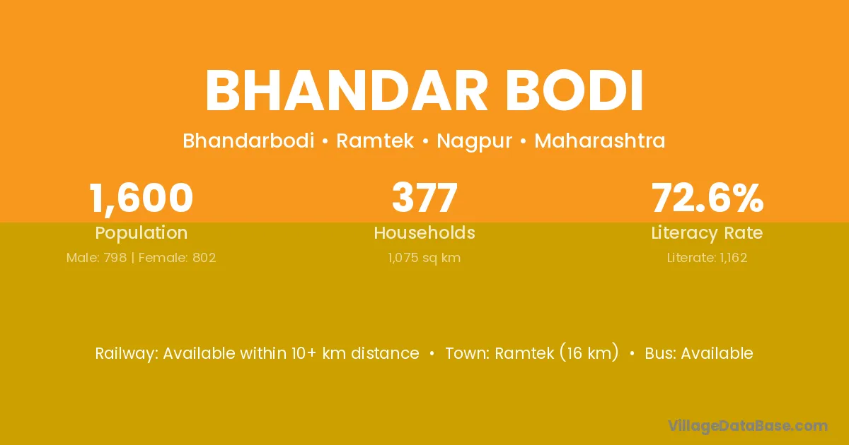 Ramtek (16 km) is the nearest town to Bhandar Bodi village for major economic activities and is located approximately 16 km away.