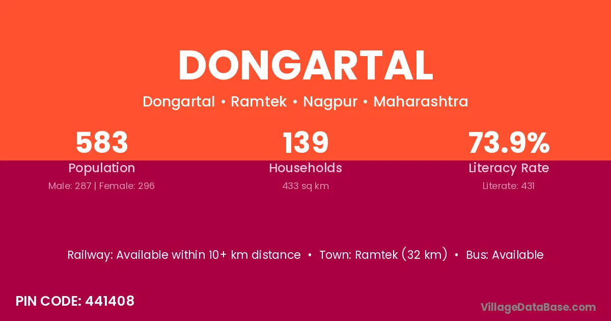 Ramtek (32 km) is the nearest town to Dongartal village for major economic activities and is located approximately 32 km away.
