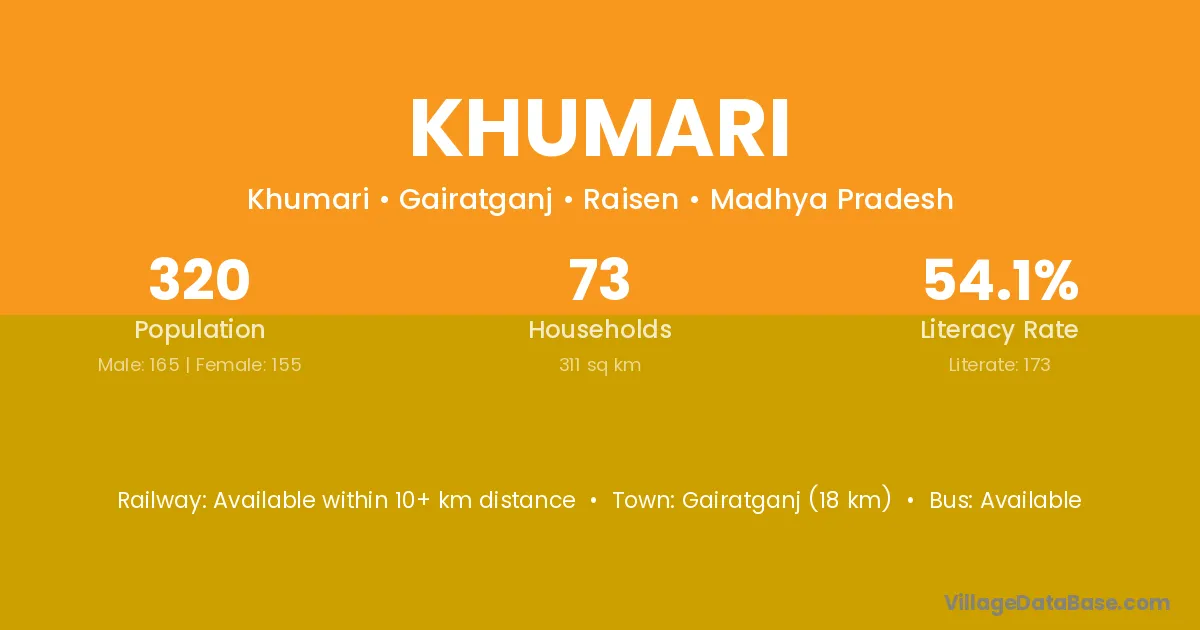 The literacy rate of Khumari village is 60.87%. Male literacy stands at 69.06% and female literacy at 51.87%.