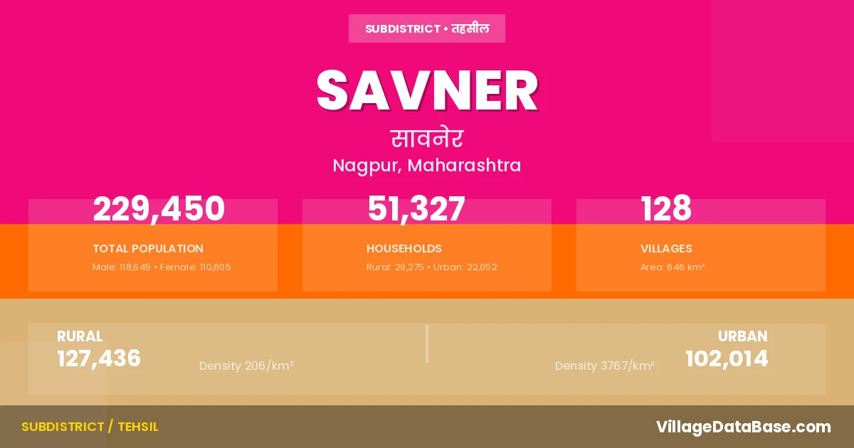According to the 2011 census The total area of Savner Tehsil is 646 km², with a population of 229450 people. The population density is 355 inhabitants per square kilometre, and there are approximately 51327 houses in the sub district.