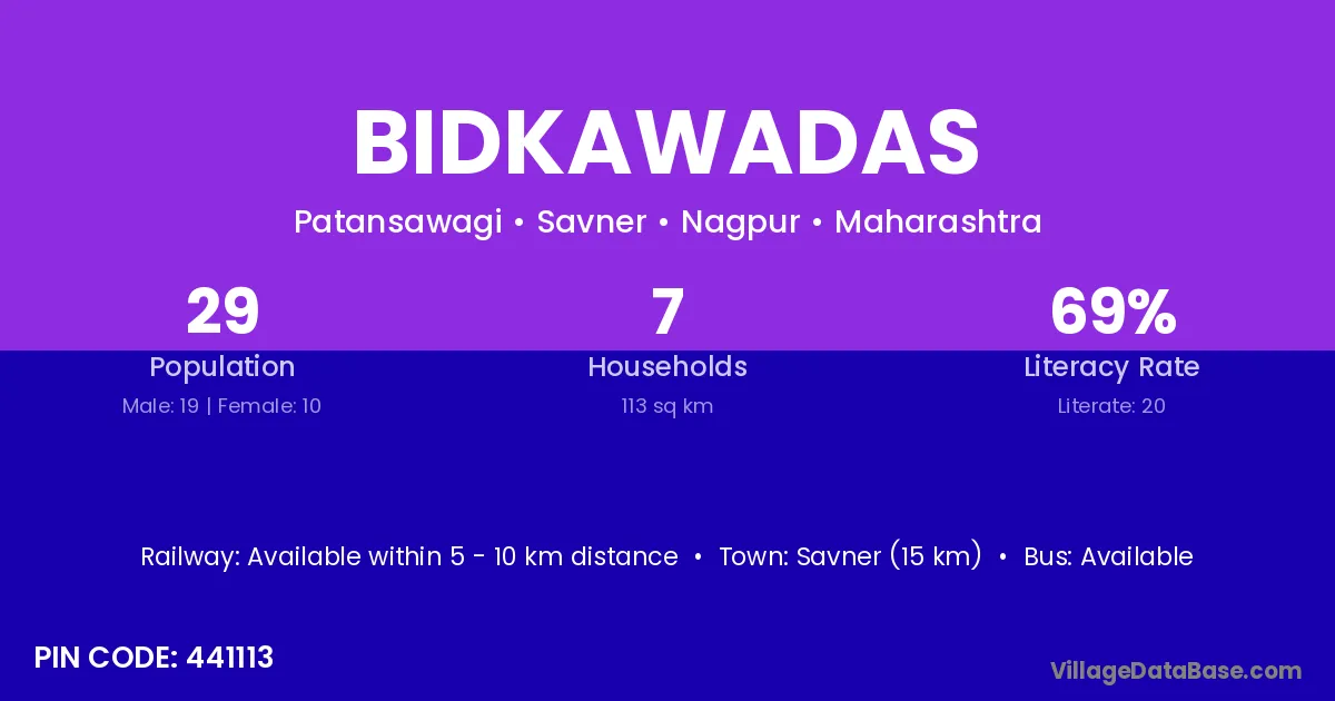 Savner (15 km) is the nearest town to Bidkawadas village for major economic activities and is located approximately 15 km away.