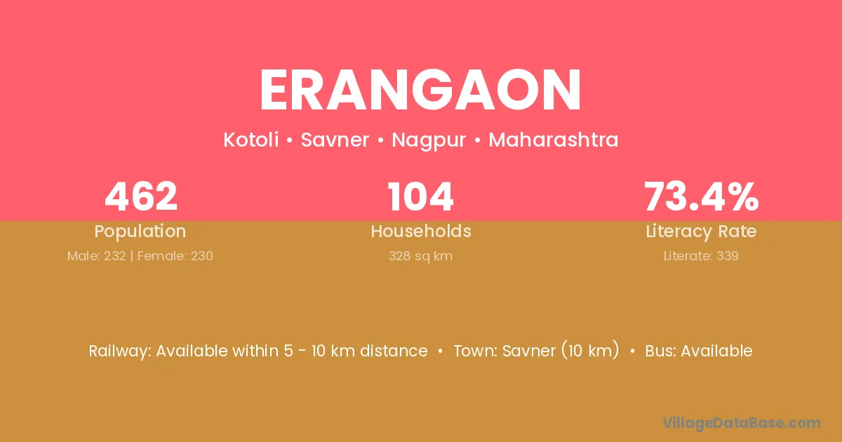 Savner (10 km) is the nearest town to Erangaon village for major economic activities and is located approximately 10 km away.