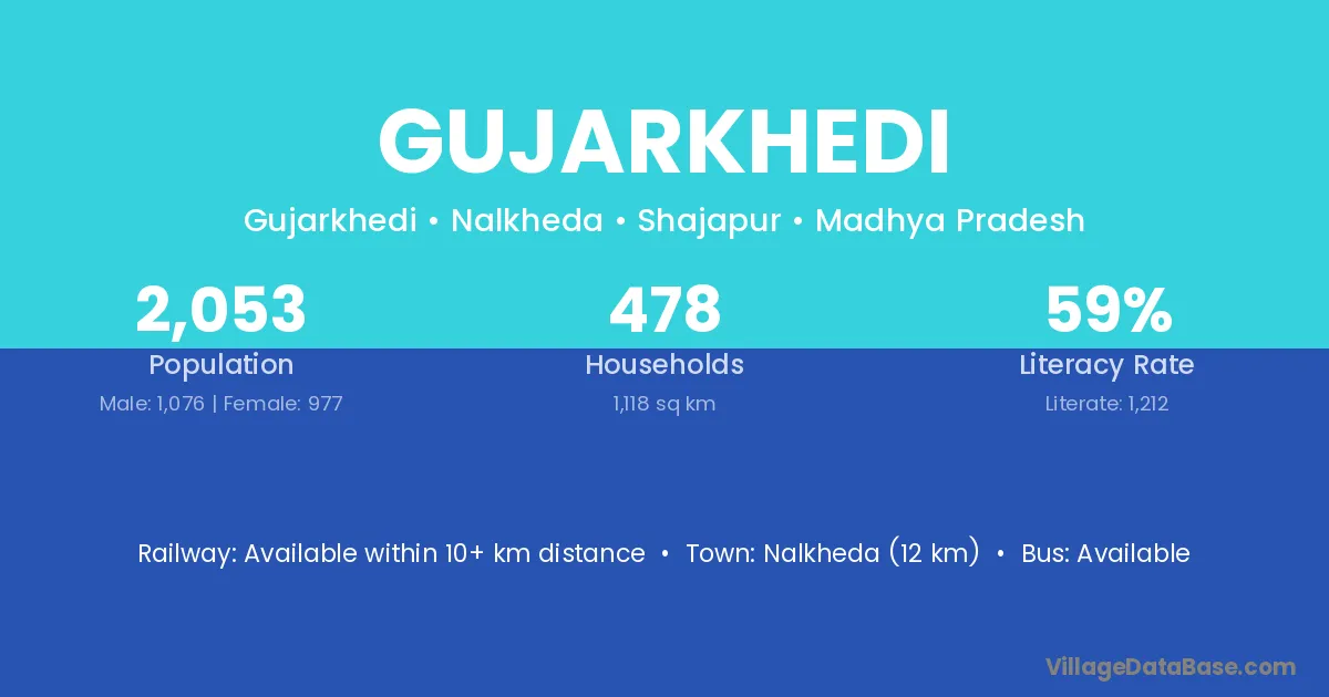 The literacy rate of Gujarkhedi village is 72.50%. Male literacy stands at 74.23% and female literacy at 70.73%.