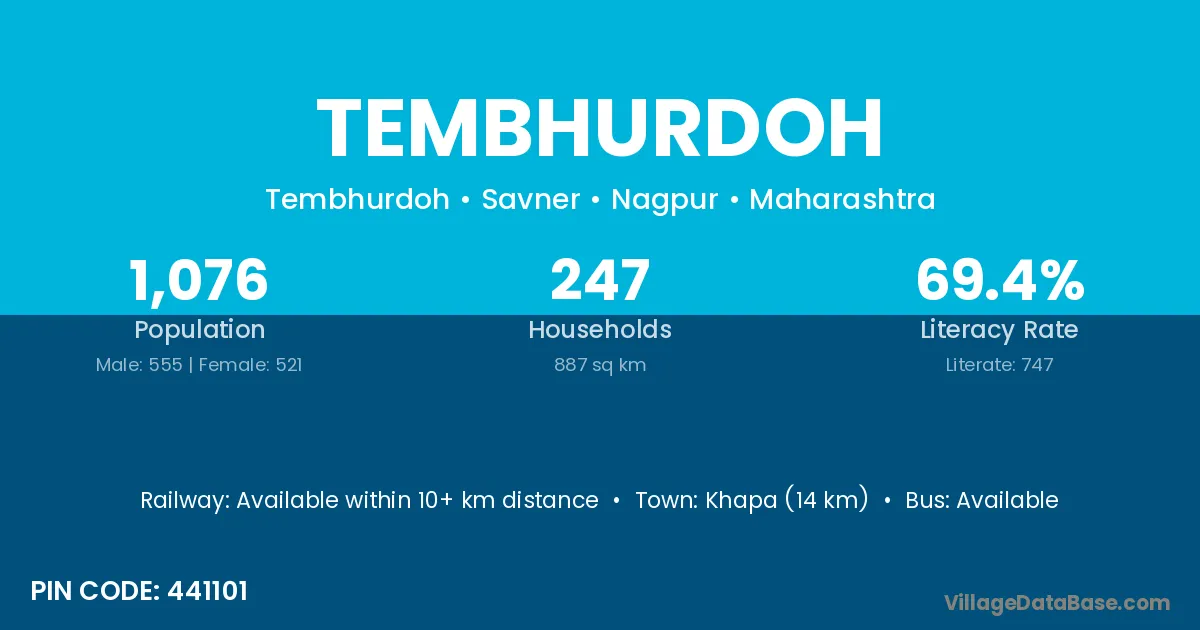Khapa (14 km) is the nearest town to Tembhurdoh village for major economic activities and is located approximately 14 km away.