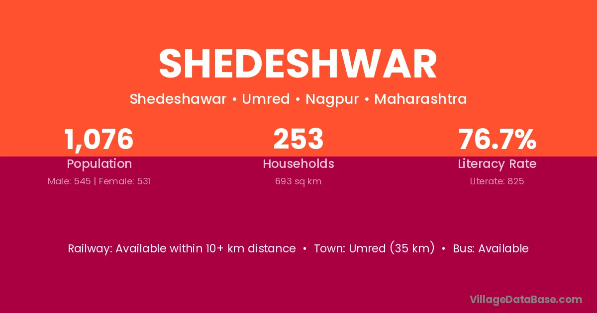 Umred (35 km) is the nearest town to Shedeshwar village for major economic activities and is located approximately 35 km away.