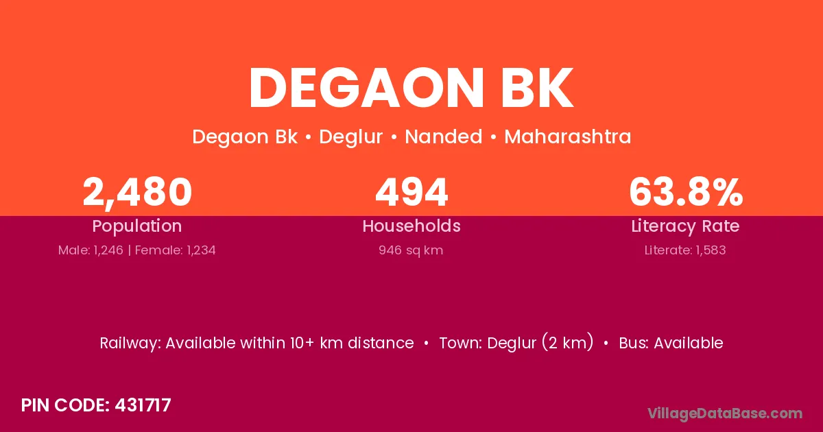 Degaon Bk village has a total population of 2,635 people, of which 1,404 are males and 1,231 are females.
