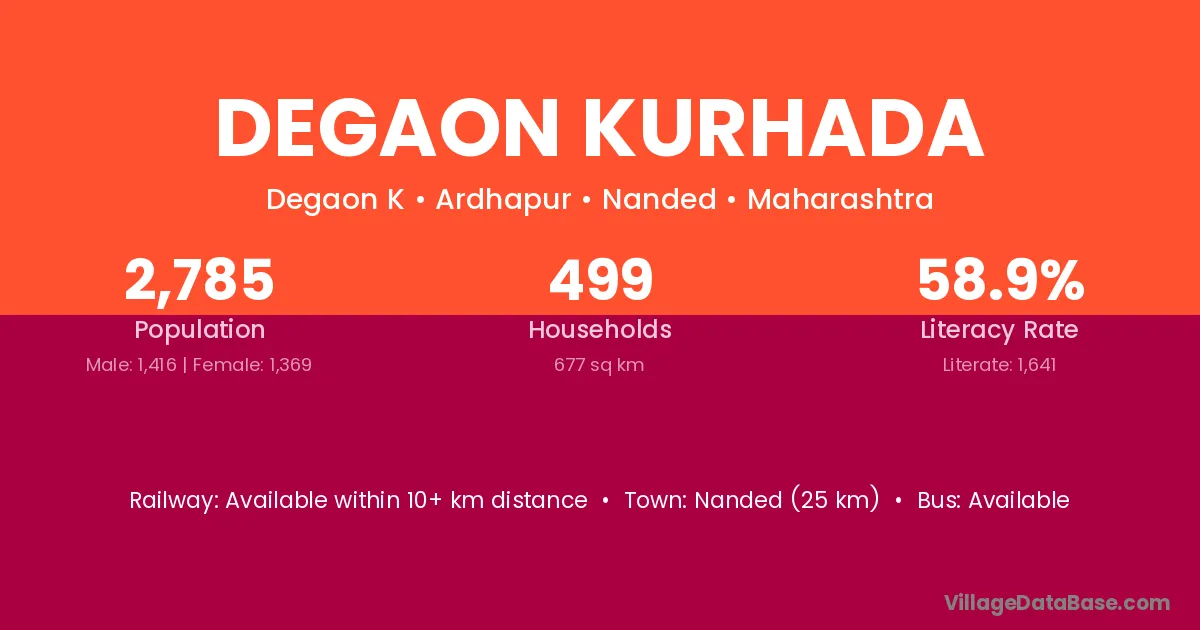 Nanded (25 km) is the nearest town to Degaon Kurhada village for major economic activities and is located approximately 25 km away.
