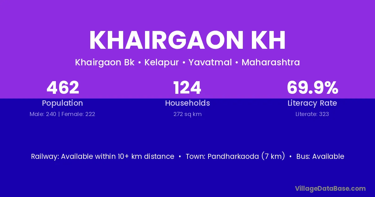 Nanded (24 km) is the nearest town to Khairgaon Kh village for major economic activities and is located approximately 24 km away.