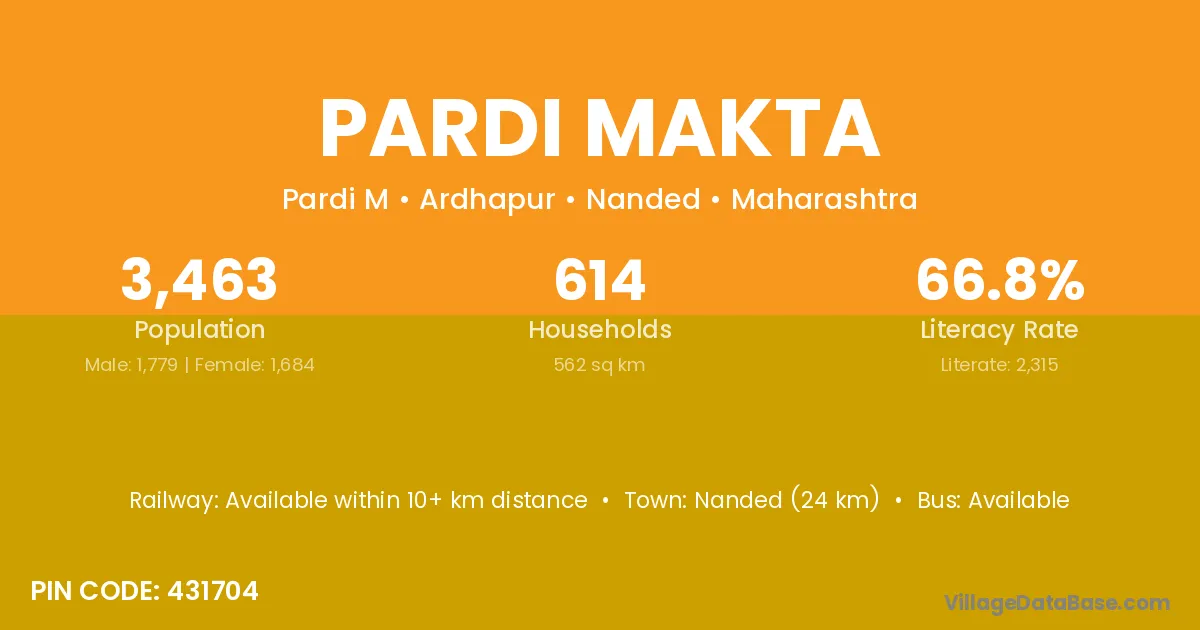 Nanded (24 km) is the nearest town to Pardi Makta village for major economic activities and is located approximately 24 km away.