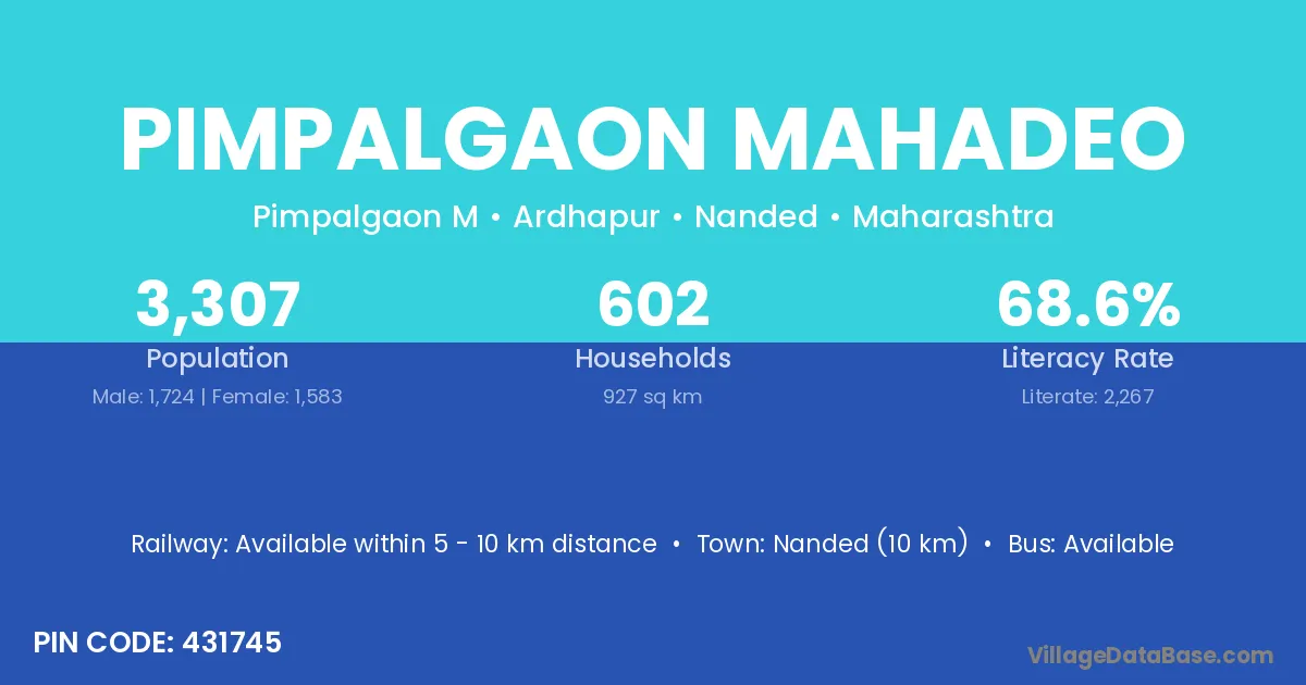 Pimpalgaon Mahadeo village has a total population of 3,307 people, of which 1,724 are males and 1,583 are females.