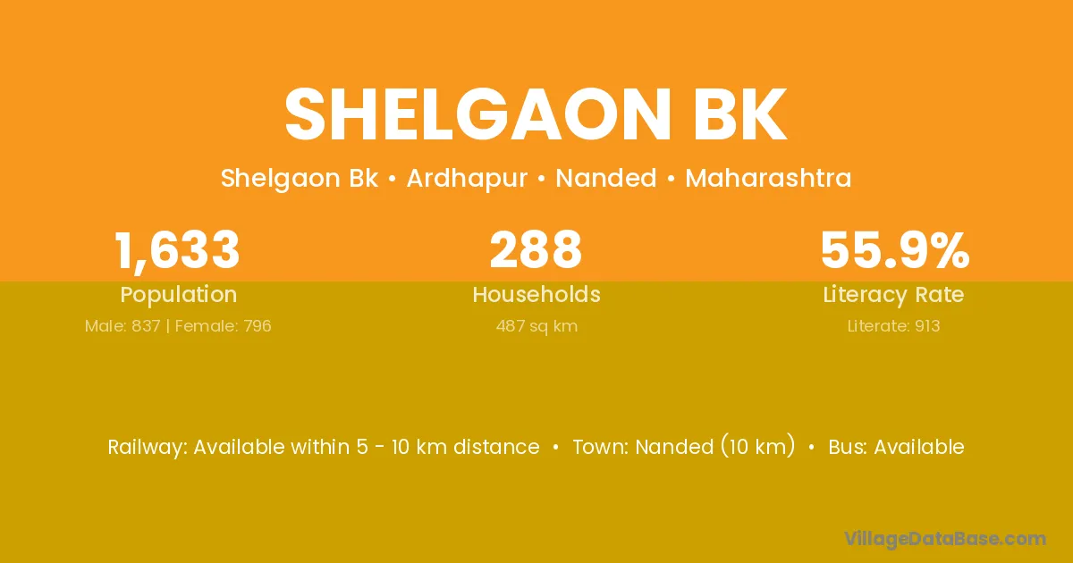 Nanded (10 km) is the nearest town to Shelgaon Bk village for major economic activities and is located approximately 10 km away.