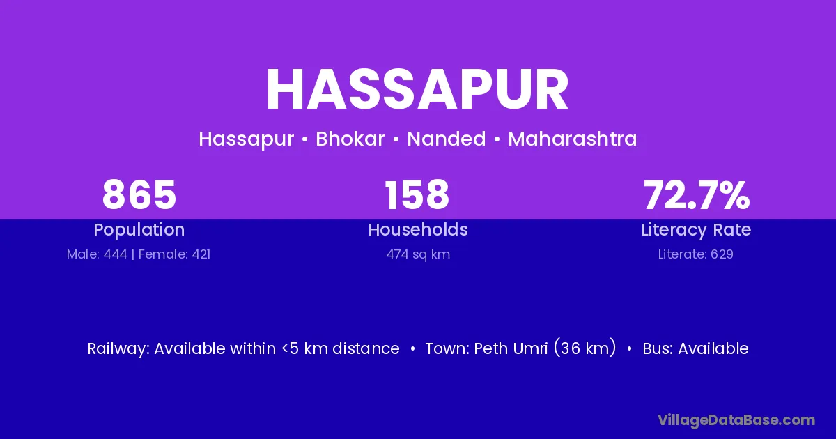 Peth Umri (36 km) is the nearest town to Hassapur village for major economic activities and is located approximately 36 km away.