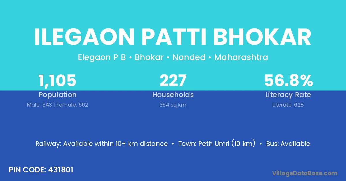 Peth Umri (10 km) is the nearest town to Ilegaon Patti Bhokar village for major economic activities and is located approximately 10 km away.